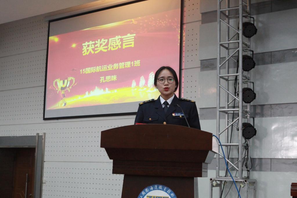 孔思咪同学代表获奖者发言。她感谢学校对学子们获得的成绩的肯定,表示要继续发愤图强、矢志不渝,积极践行“德行四海”校训,在实现自己的人生理想、人生价值的道路上持续追求,用实际行动积极践行社会主义核心价值观。