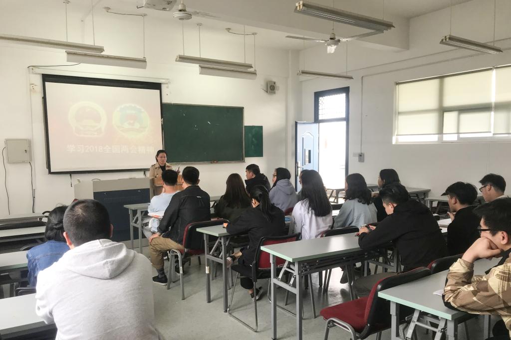 3月19日和3月26日,党支部书记郑忠义通过形势与政策课程,向岱山校区全体学生传达了“两会”精神。从“两会”开幕到胜利闭幕,他分别给同学们讲解了《宪法修正案》、国际机构改革方案、《监察法》与监察委员会、国家领导人选举等重大议题,并将刊有两会内容的《舟山日报》分发给两个班级的同学们。