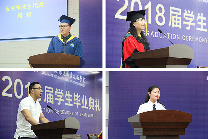 1999届轮机专业校友华军杰、2015届船舶工程技术专业校友毛晟亦、2008届旅游管理专业校友刘晓、2015届商务英语专业校友张玉婷和乌克兰马卡洛夫国立造船大学国际部主任Mykhailov Mikhail也为毕业生们送上了真挚的祝福和宝贵的建议。