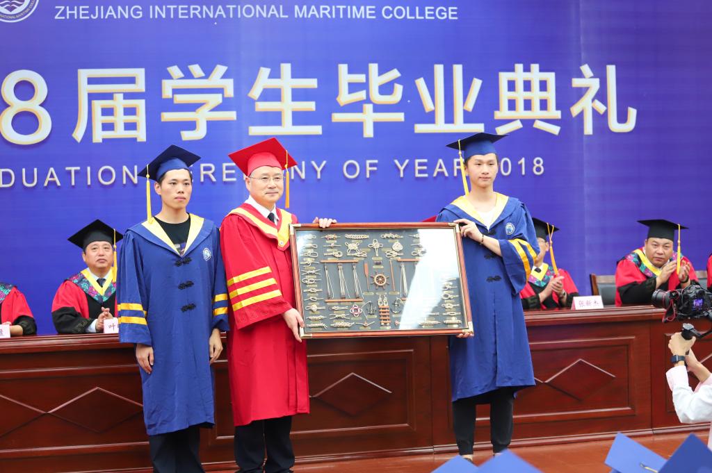 毕业生代表向学校赠送了郑和时期的航海地图和同学们亲手制作的绳结、绳画、船模、集装箱模型、字画、照片集等礼物,表达2018届全体毕业生对母校的深深依恋与祝福。陈松华书记和王捷校长郑重接过学子们的这一份份心意,典礼现场再次掀起热潮。