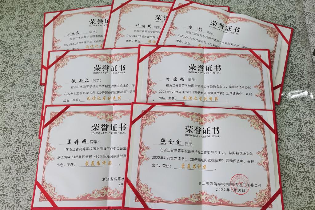 近日,由浙江省高校图书情报工作委员会主办的2022年“世界读书日活动”结果公布,学校图书馆(数字技术中心)荣获“最佳组织奖”。航海工程学院吴梓嫣、燕金金2位同学荣获省“最美书评奖”,港口管理学院王晓霞、张雨浩、方越、叶俪琪和国际教育学院叶宣兆5位同学荣获省“阅读之星优秀奖”。