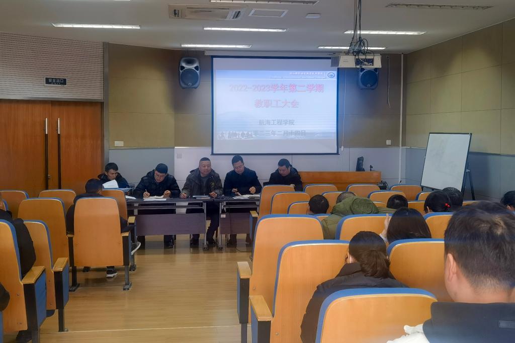2月14日下午,航海工程学院在船舶实训楼三楼OOCL厅召开了2022-2023学年第二学期全体教职工大会。学院党政班子、全体教职工参加会议,会议由学院党总支书记李刚主持。
