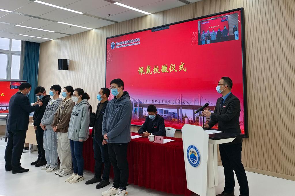 典礼上,夏志刚副校长为六位新生代表佩戴校徽并合影留念。