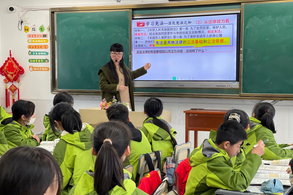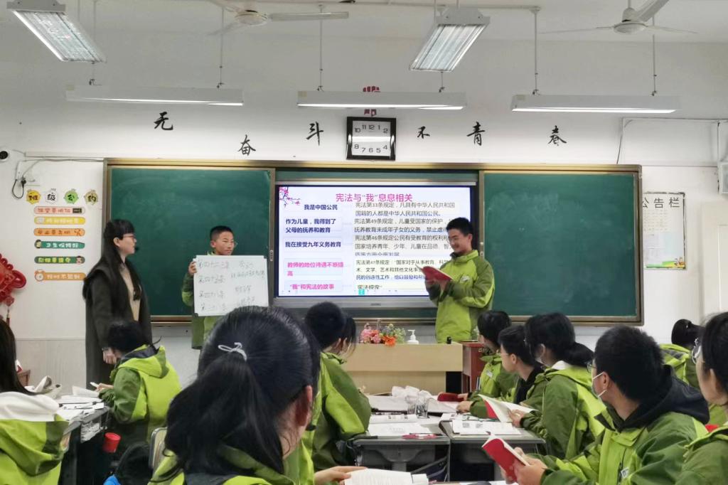 如何以大中小学思政课一体化推进习近平法治思想落地落实,3月30日,沈家门第一初级中学的李喆老师演绎了一堂《增强宪法意识》的公开课。这是一场以习近平法治思想进课堂为主题的大中小学思政课一体化研学活动,在现场每位学生和听课老师都领到1本宪法汇编读本。来自学校马克思主义学院的思政课一体化团队专程赴普陀区沈家门第一初中,与学校领导一起共同观摩了公开课。