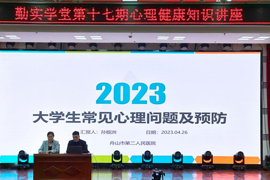 为进一步加强我校心理健康教育,加强医校合作,切实维护师生身心健康,4月26日下午,学校心理健康教育中心邀请舟山第二医院孙舰洲医生为我校师生带来了一场《大学生常见心理问题及预防》的心理健康知识讲座。各二级学院副书记、辅导员、学校专职心理健康教育教师以及各二级学院学生代表参加了此次讲座。