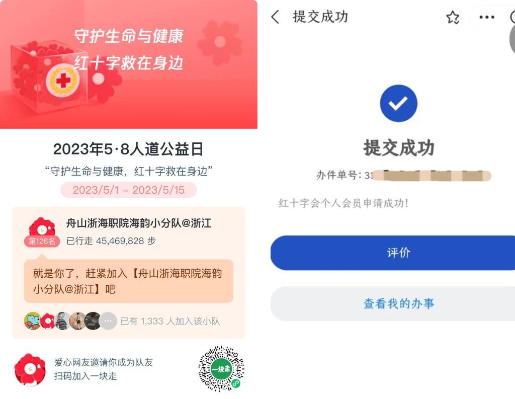 学校还通过“守护生命与健康,红十字救在身边”健步走公益活动,建立“舟山浙海职院海韵小分队@浙江”小分队。各二级学院从5月1日起组织学生加入“舟山浙海职院海韵小分队@浙江”,参加“一块走”健步公益活动,同时组织学生通过“浙里办”申请加入红十字会,成为校红十字会新会员。