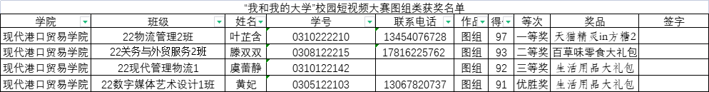 本次短视频比赛分为视频类和图组类,参赛者可以围绕文明校园、绿色校园、诚信校园、志愿之风、勤俭节约、中华传统美德等题材制作公益广告短视频,也可以围绕校园美丽景色、校园多彩生活、我和我的同学的故事、实习生活、校园趣闻等内容,记录校园生活、同学才艺、师生情谊等,用以展现青春阳光的大学生形象。经过为期一个月的制作征集,本次比赛共收到三个学院的24组参赛作品。经过赛组委的评判打分,最终现代港口贸易贸易学院2022级现代物流管理2班叶芷含同学和2022级现代物流管理1班丁中海同学分别获得视频类和图组类一等奖。