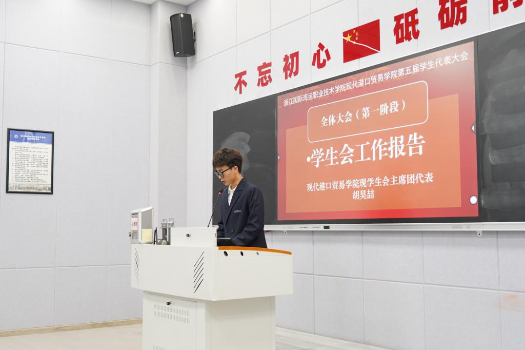 随后,现代港口贸易学院学生会成员胡昊喆同学代表学生会作了2022-2023学年学生会工作报告,他回顾了过去一年的工作成果,进行了总结与反思,并提出了今后的工作目标及展望。