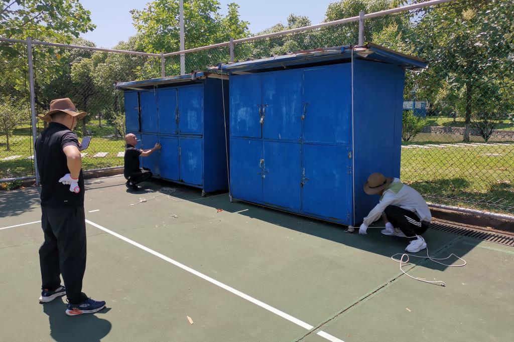 对体育场馆楼顶四周排水通道进行清理,防止雨水堵塞,对体育场馆内部门窗、水电各类设施设备进行一一排查,检查了田径场、室外篮球场地的体育设施、围网的安全状况,对跳高垫防护棚和室外篮球储物柜进行了加固,以防暑期台风带来的安全隐患,确保游泳馆通道关闭,舞蹈房、钢琴房电源及门窗等相关设施妥善关闭。
