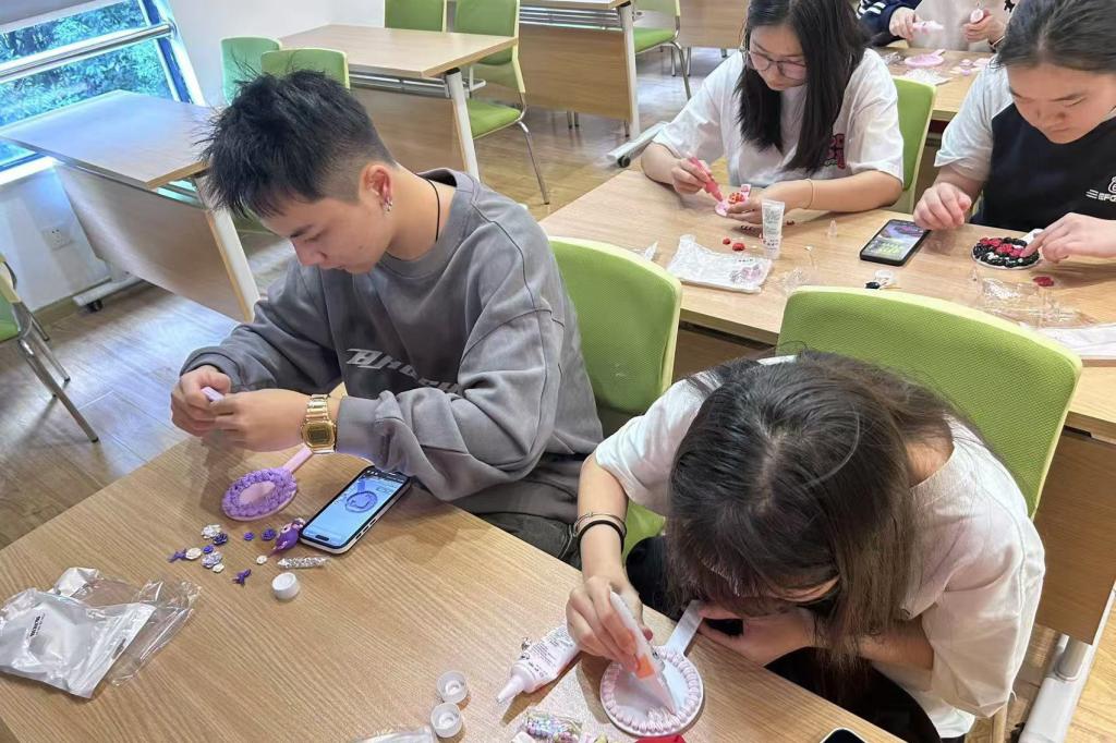 学生志愿者们在教室里两两组合,围绕活动主题,借助奶油胶、小饰品等材料,尽情挥洒自身想象力,在镜子上精心设计出了极具创意的搭配,展现出了学子的活力与创造力,为社区活动增添了别样精彩。
