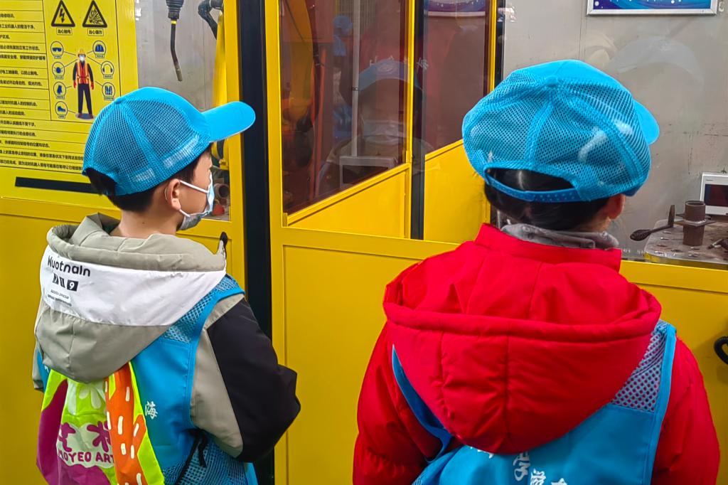 活动首站,学生们走进海洋装备工程学院舰船科普教育基地的船舶知识馆。通过李云老师的介绍,他们学习了中国船舶工业的发展历程,了解了船舶设计、建造的基本流程以及散货船、集装箱船、油船等不同船型的特点。在焊接机器人实训中心,学生们近距离观察了自动化焊接设备,直观感受现代工业技术的高效与精准。随后,学生们进入1:6大型散货船钢制模型内部,实地探索船舶结构,从船首、货舱到船尾,通过触摸与观察,理解船舶结构的设计内涵。