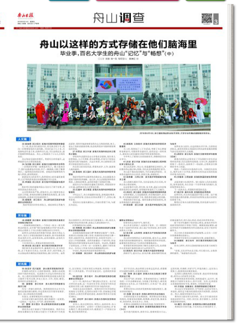 今起,本报《毕业季,百名大学生的舟山“记忆”与“畅想”》(上、中、下),分风物篇、美食篇、交通篇、绿色篇、人文篇、时光篇、芳华篇、变迁篇、国际化篇、创业篇10个篇章,记录这段青春不散场。