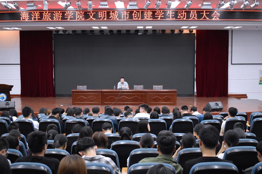 10月11日晚,海洋旅游学院组织全体在校生在图书馆四楼报告厅召开全国文明城市创建学生动员大会。