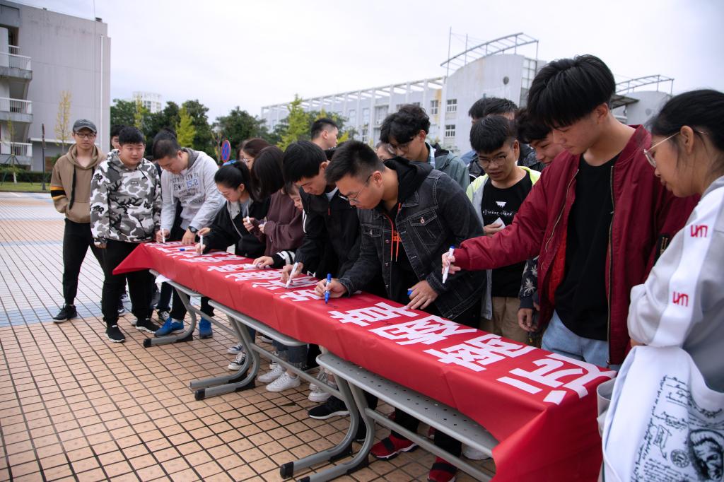 10月15日,在国际教育学院升旗仪式上,学院志愿者代表向全院师生宣读创全国文明城市以及校园禁烟倡议书,各班班委代表班级在“远离烟草,崇尚健康,爱护环境”的横幅上签字,活动提高了学生对吸烟有害健康的认识,让禁烟观念深入人心,为创城活动贡献力量。(文/管建民 图/周颖珊、章君)