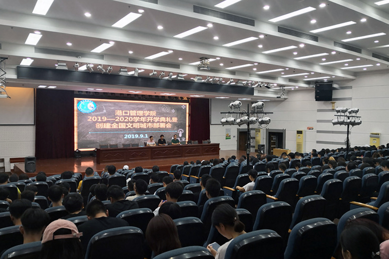 9月1日晚,港口管理学院在图书馆四楼报告厅召开2019-2020学年开学典礼暨创建全国文明城市工作部署会。会议由港口管理学院书记苏峰主持,学院党政班子、辅导员、全体2018级学生共400余人参加。