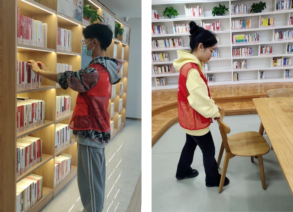 每次志愿活动,志愿者们都仔细对照书籍编号,将图书进行分类整理;排齐桌椅、清理垃圾,助力图书馆营造良好舒适、干净整洁的阅读环境。